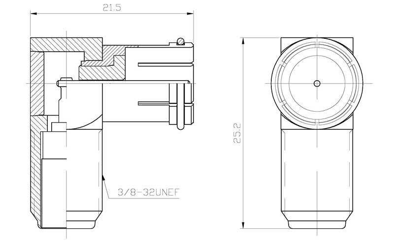屋内で使用する90度F型アダプタです。直列ユニットでケーブルを直角に立ち下げる際に使用します。
